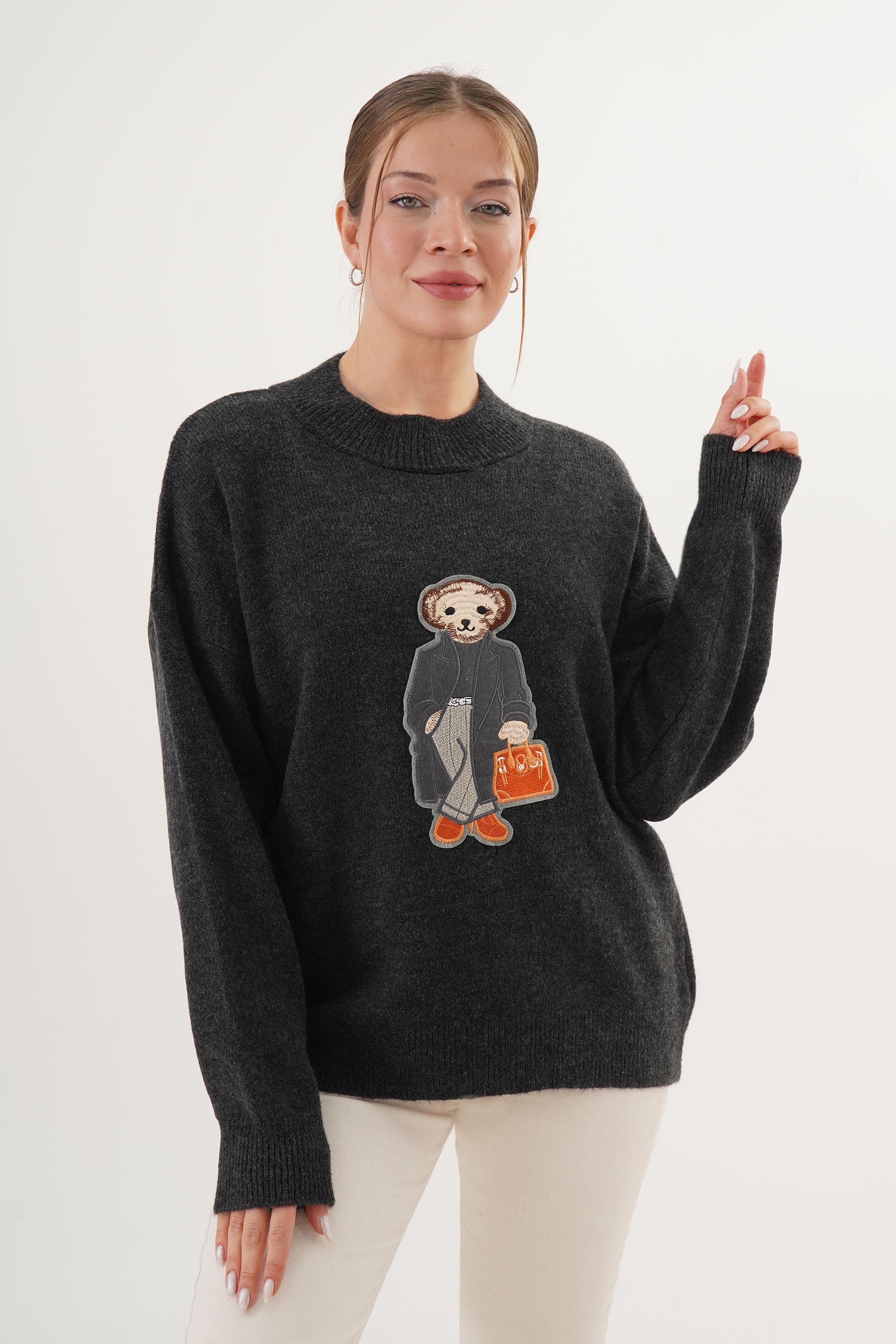 Ayıcık Nakışlı Bisiklet Yaka Toptan Antrasit Triko Kazak (6587-ANTRASİT)
