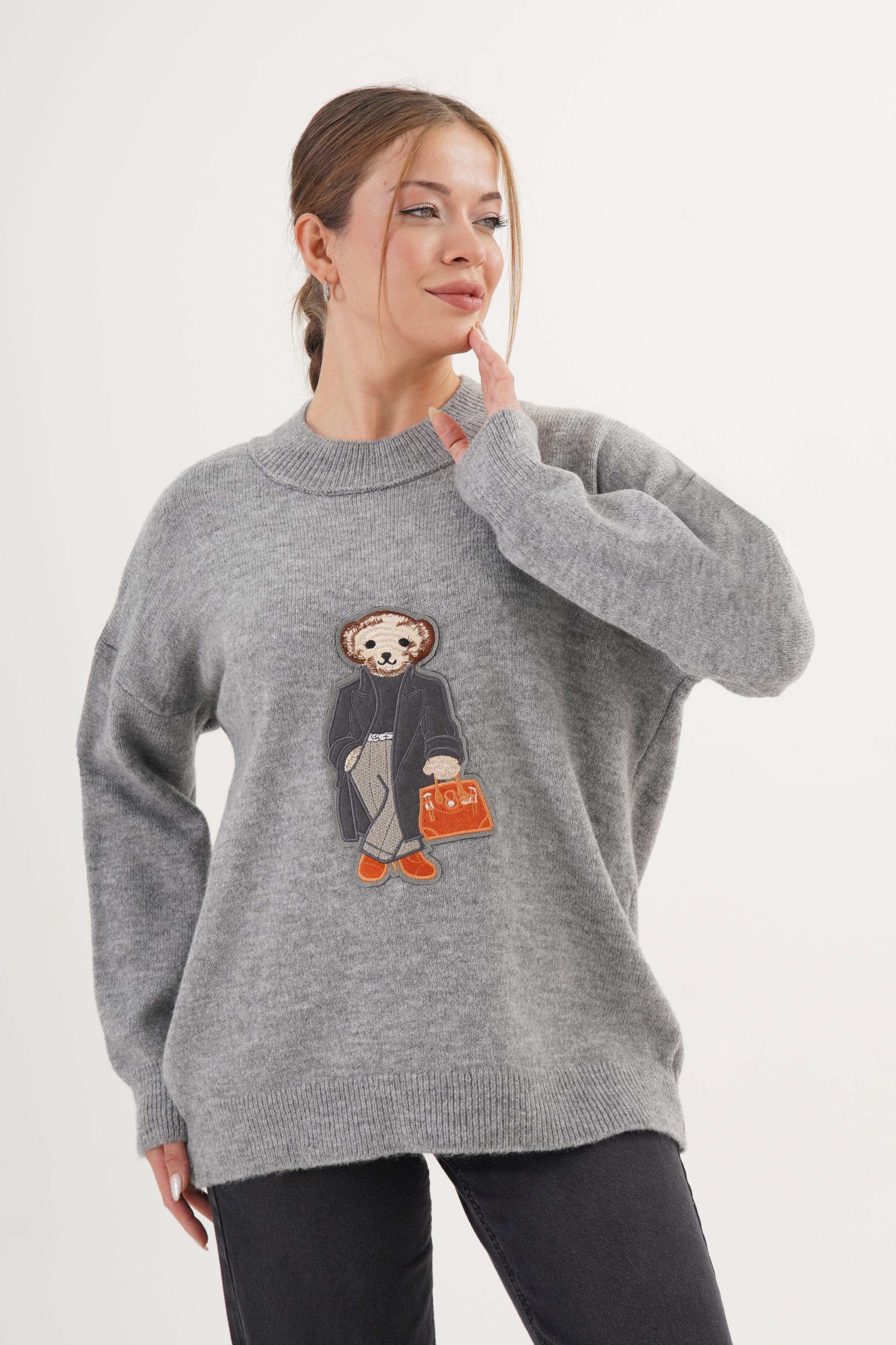 Ayıcık Nakışlı Bisiklet Yaka Toptan Gri Triko Kazak (6587-GRİ)