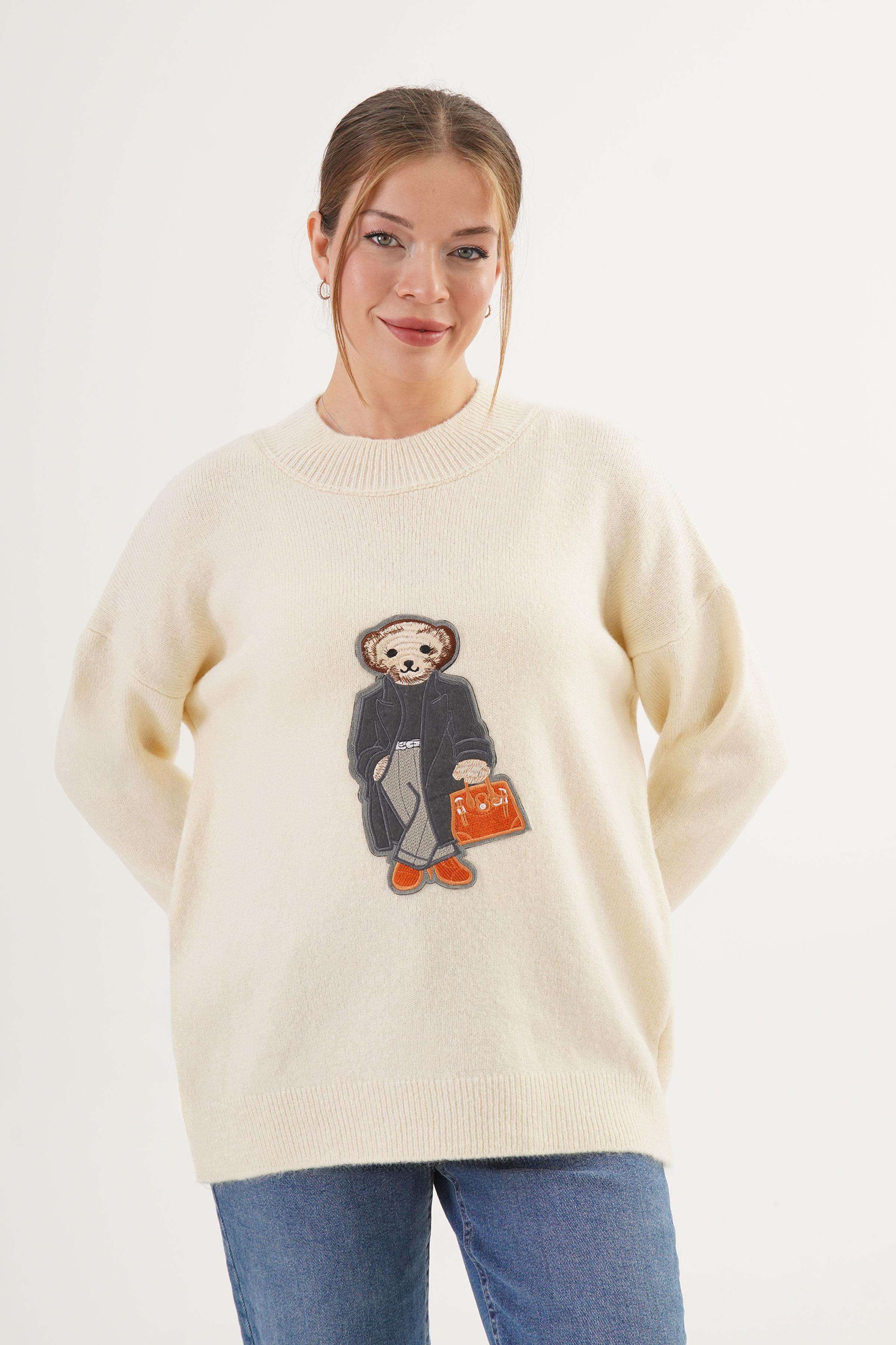 Ayıcık Nakışlı Bisiklet Yaka Toptan Krem Triko Kazak (6587-KREM)