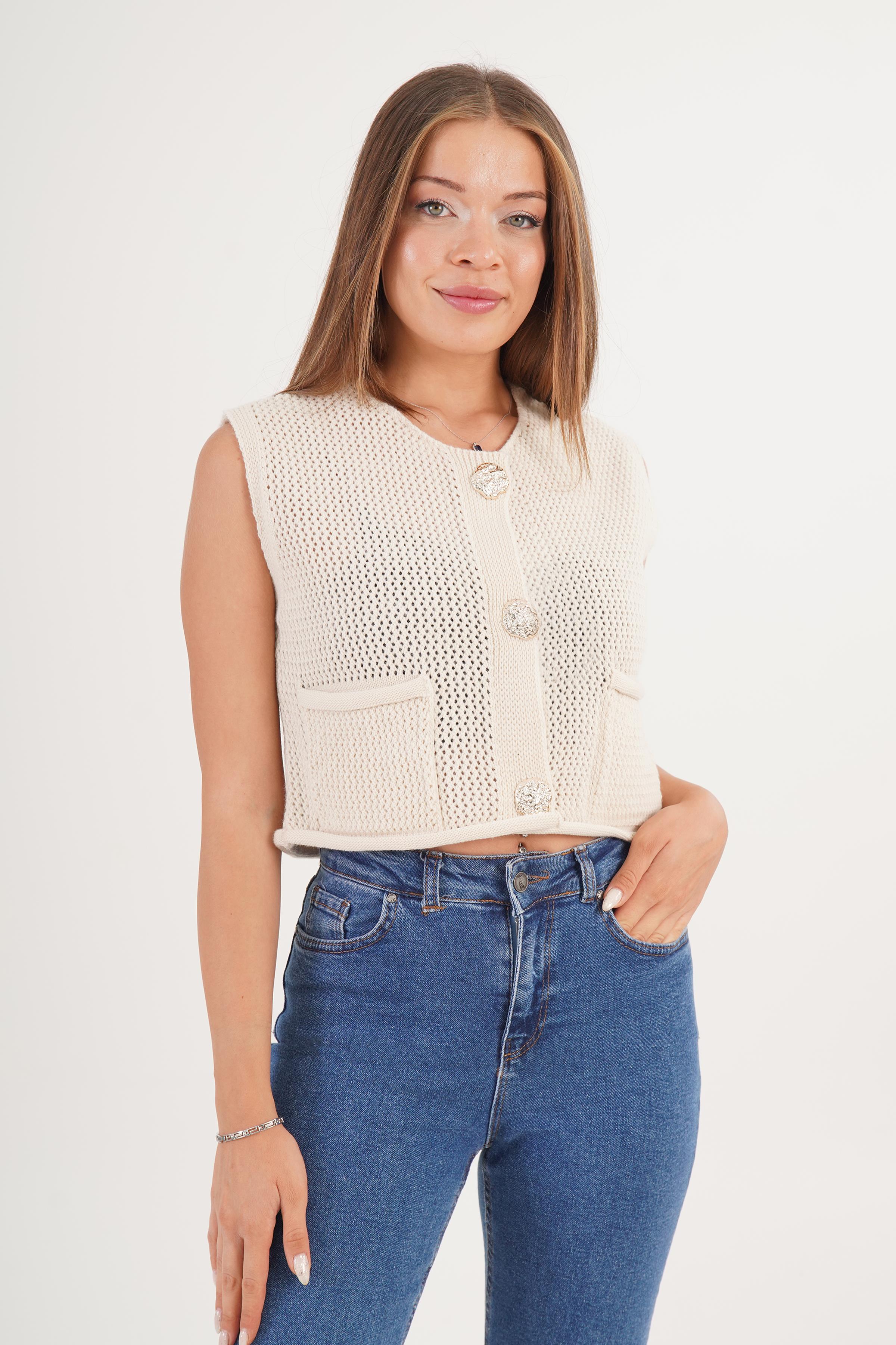 Gold Düğmeli Çift Cep Toptan Taş Triko Yelek