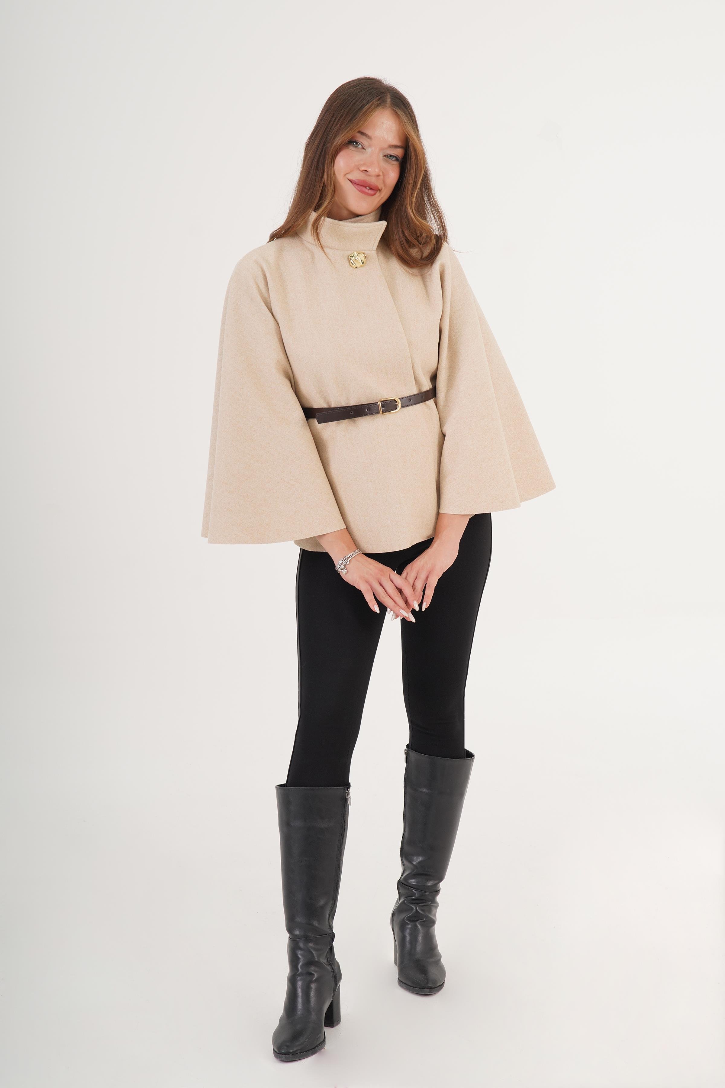 Kemer Detaylı Tek Düğmeli Toptan Krem Panço