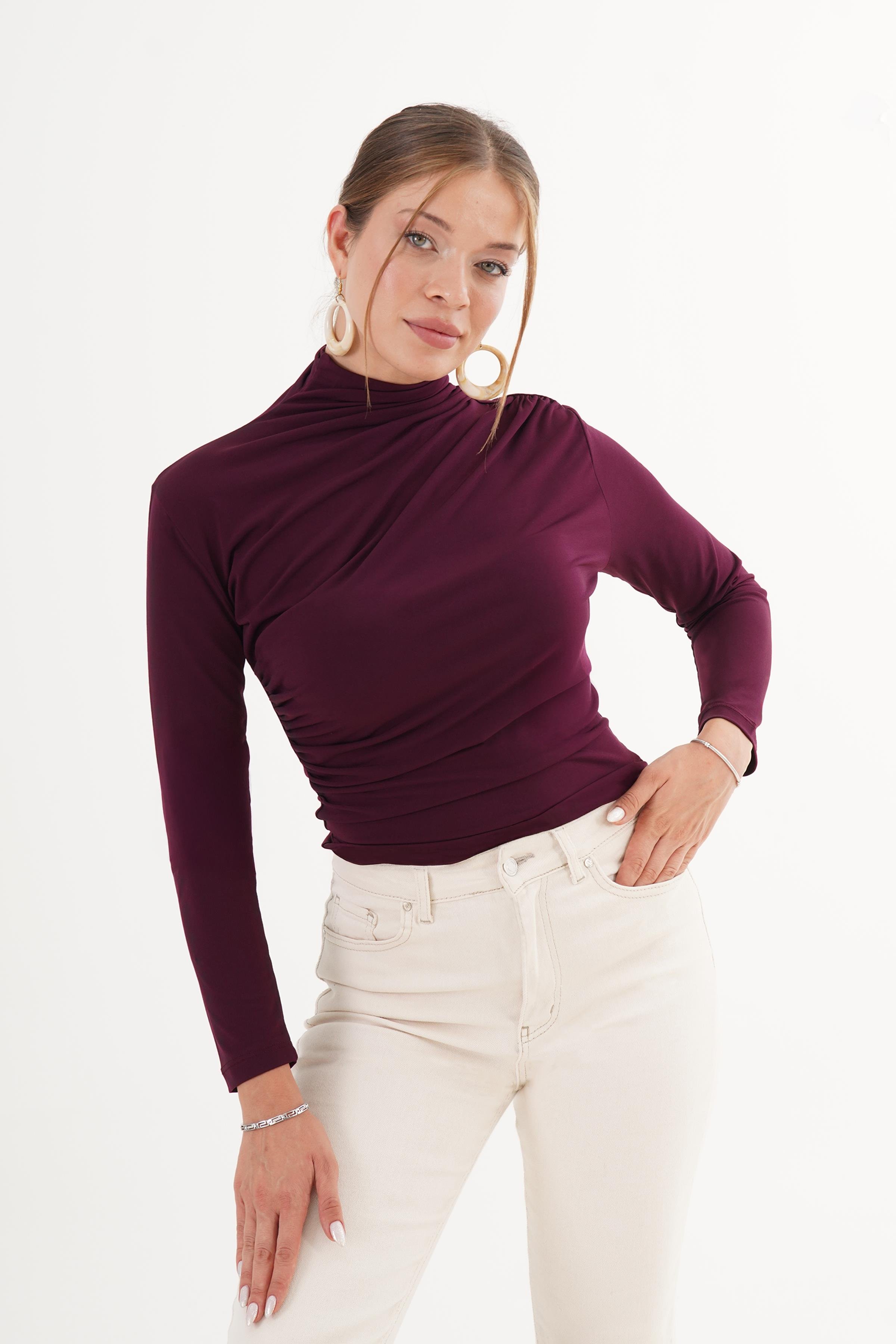 Omuz ve Bel Büzgülü Dik Yaka Toptan Mürdüm Bluz