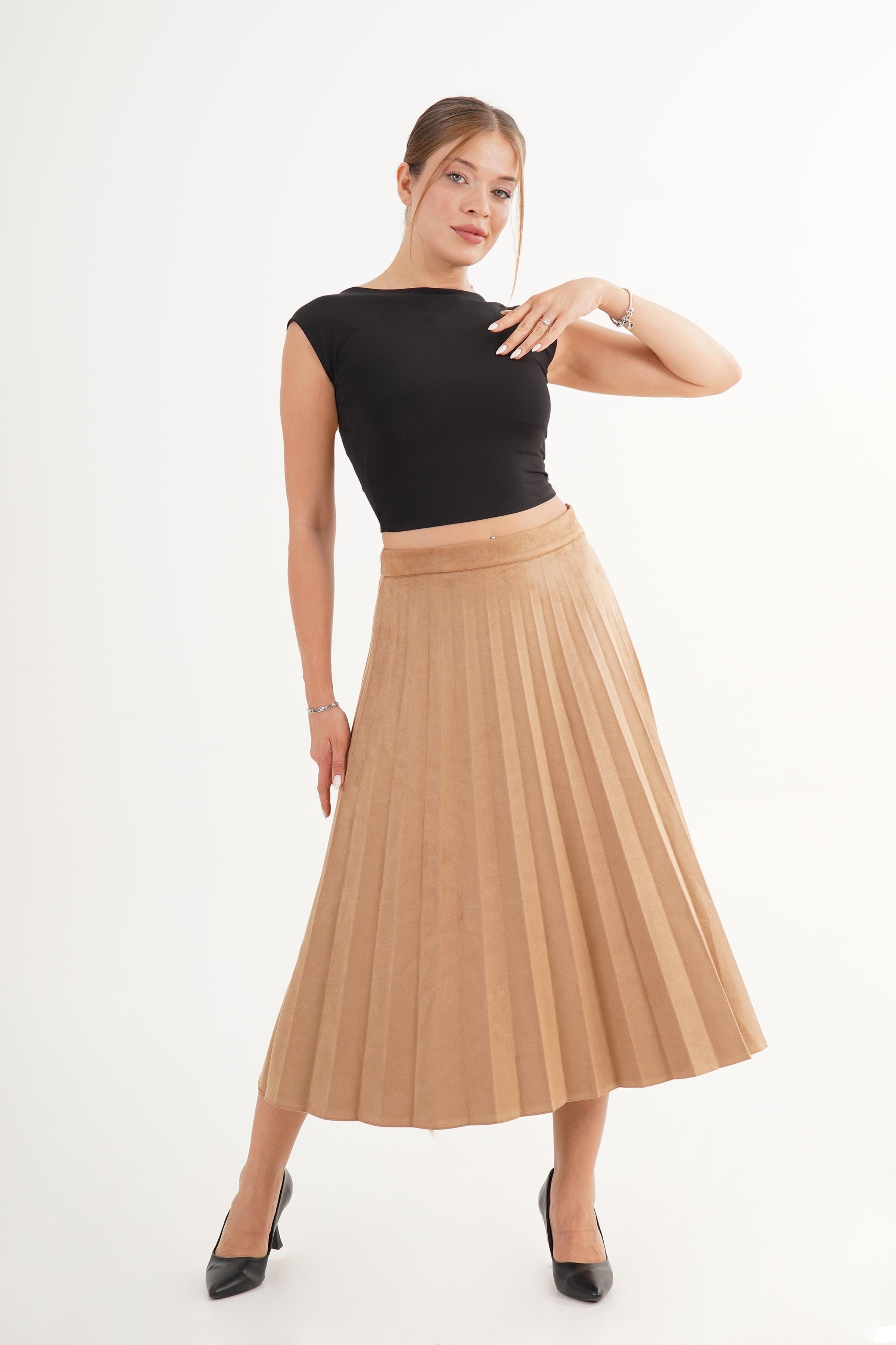 Piliseli Yüksek Bel Vizon Toptan Süet Uzun Etek