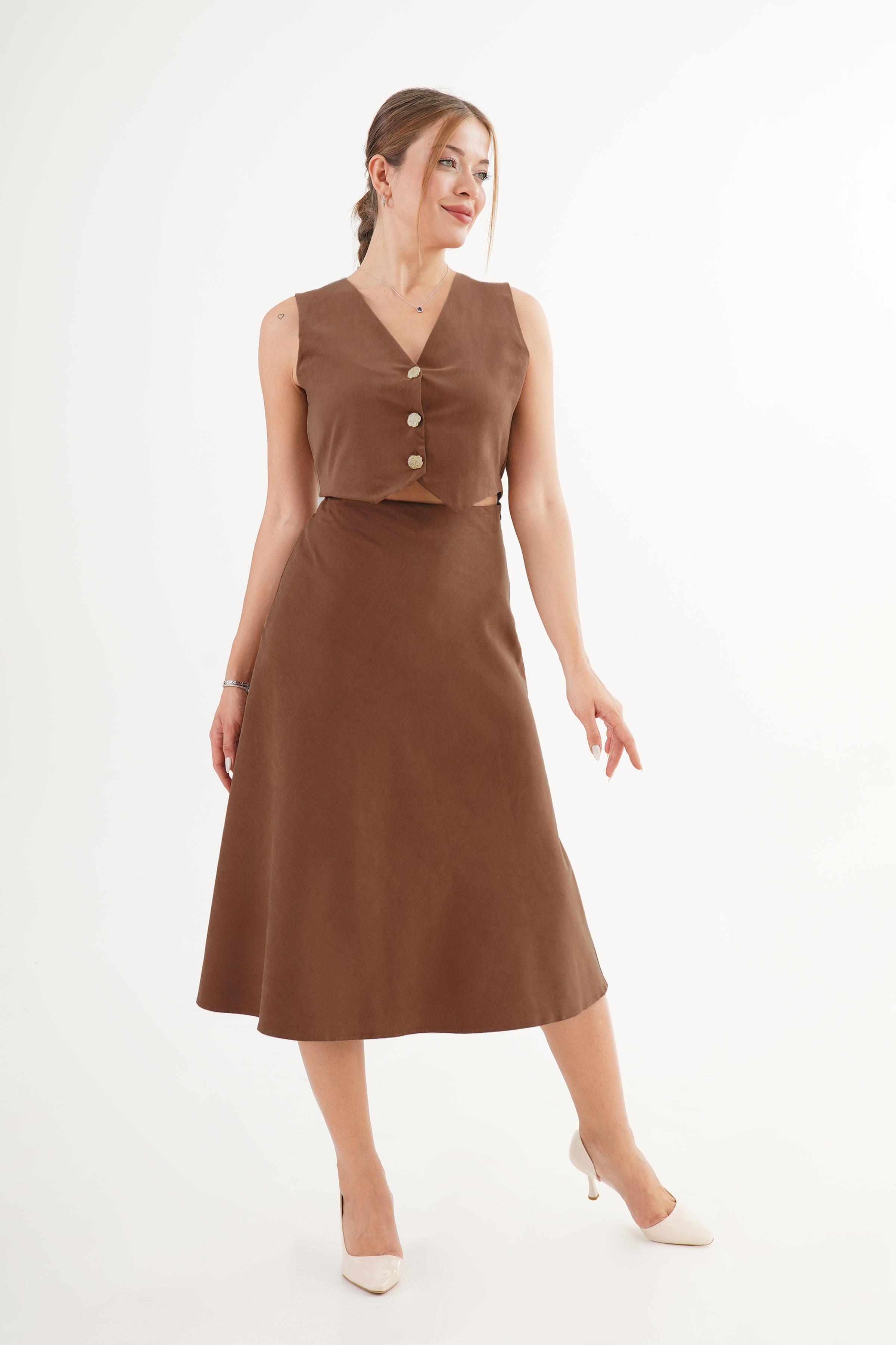 Premium Yelek Ve Etek Taba Süet Toptan İkili Takım (4848-1-TABA)