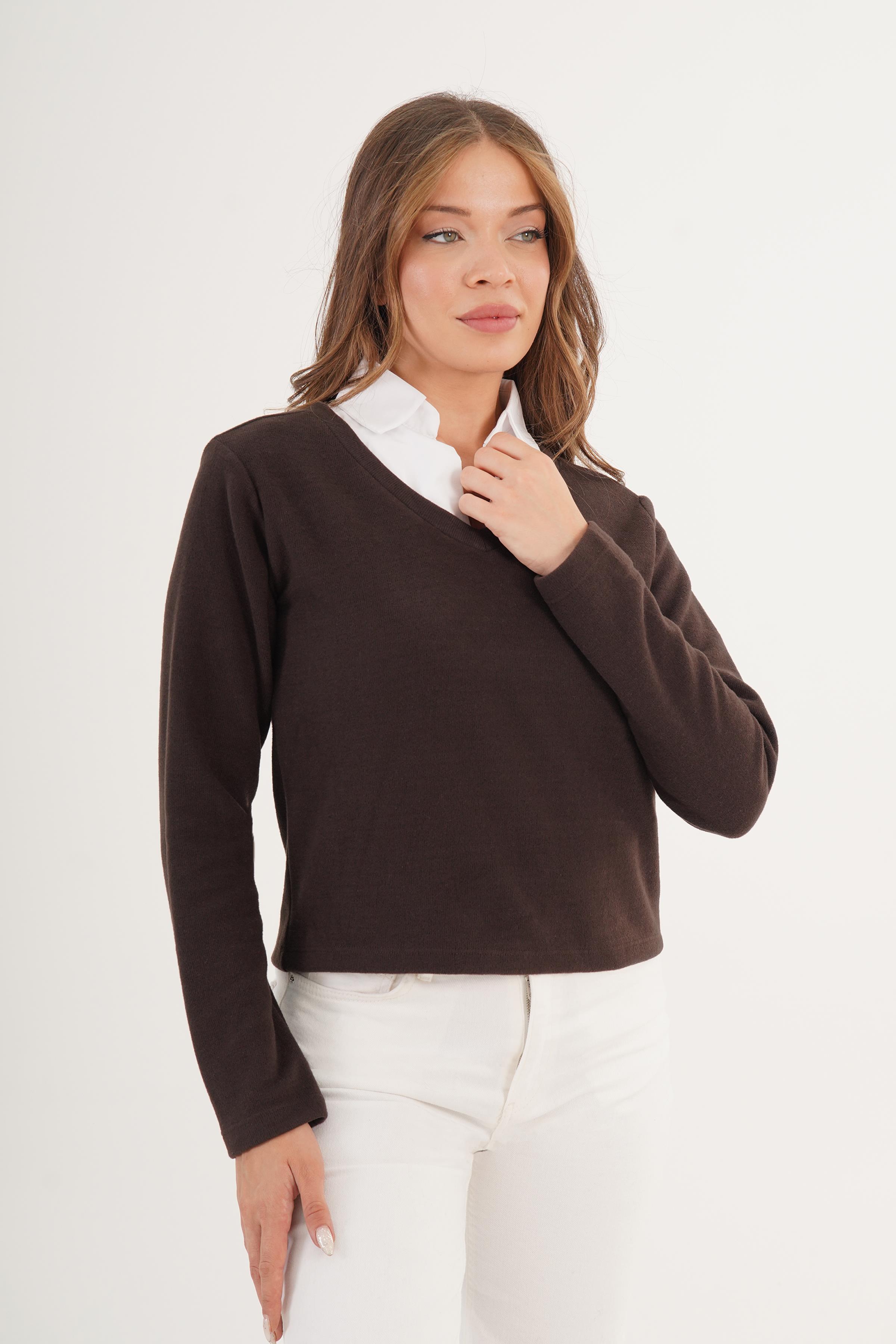 Gömlek Yaka Garnili Kahve Toptan Bluz