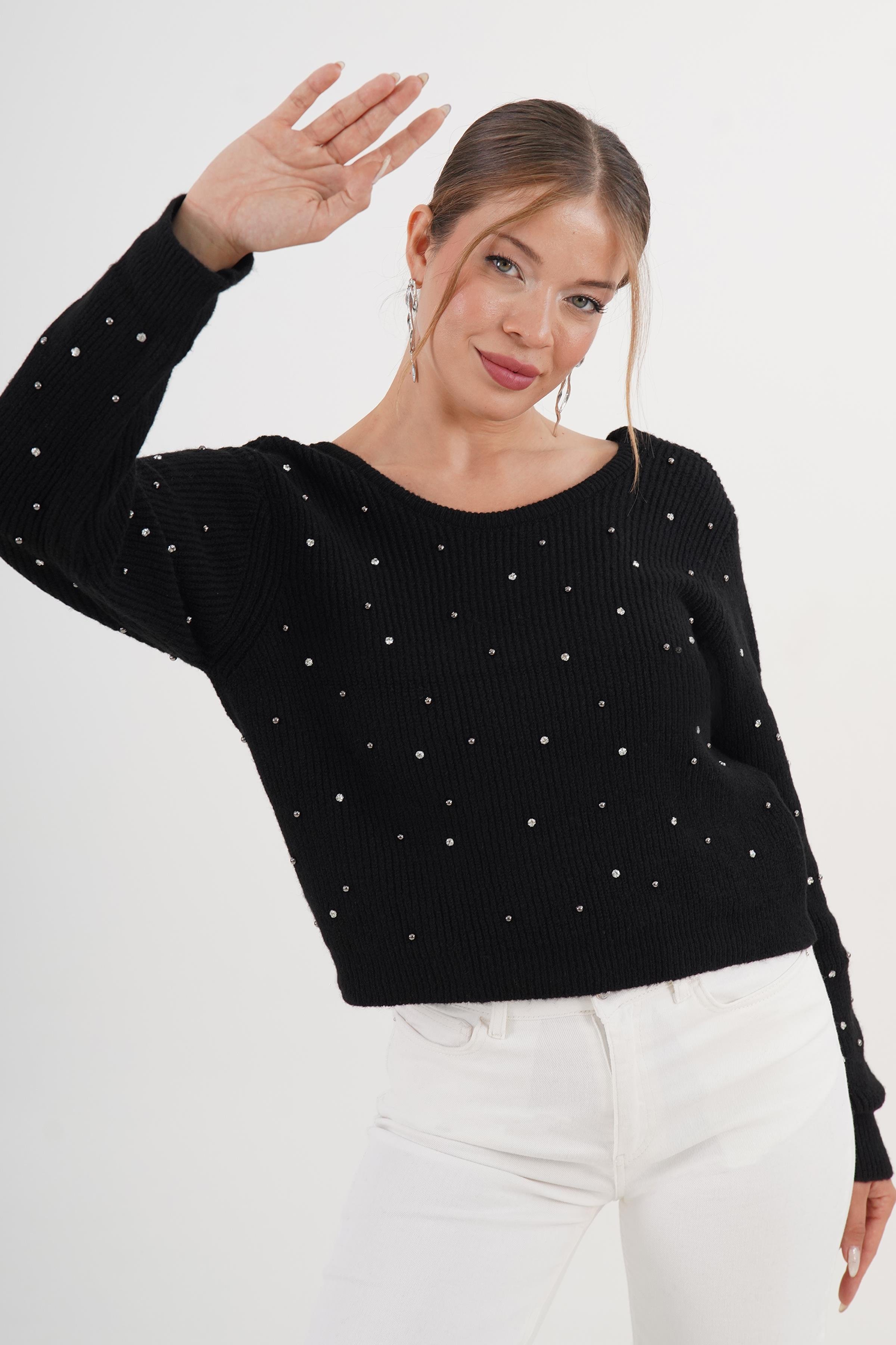 Sırt Dekolteli Siyah İşlemeli Pembe Toptan Kazak (6453-SİYAH)