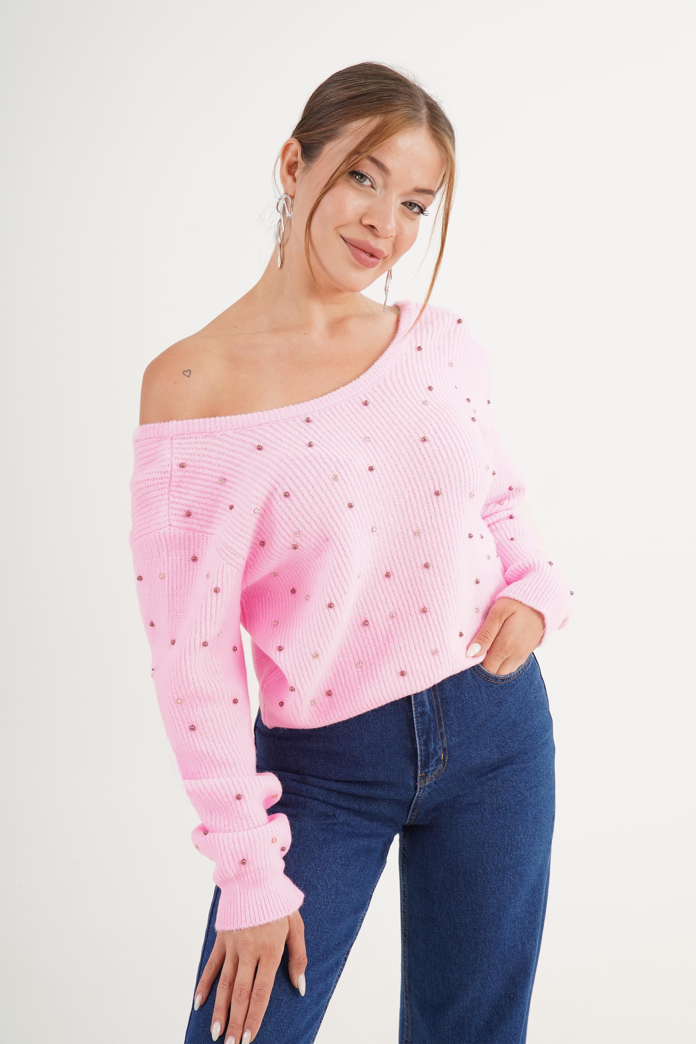 Sırt Dekolteli Taş İşlemeli Pembe Toptan Kazak