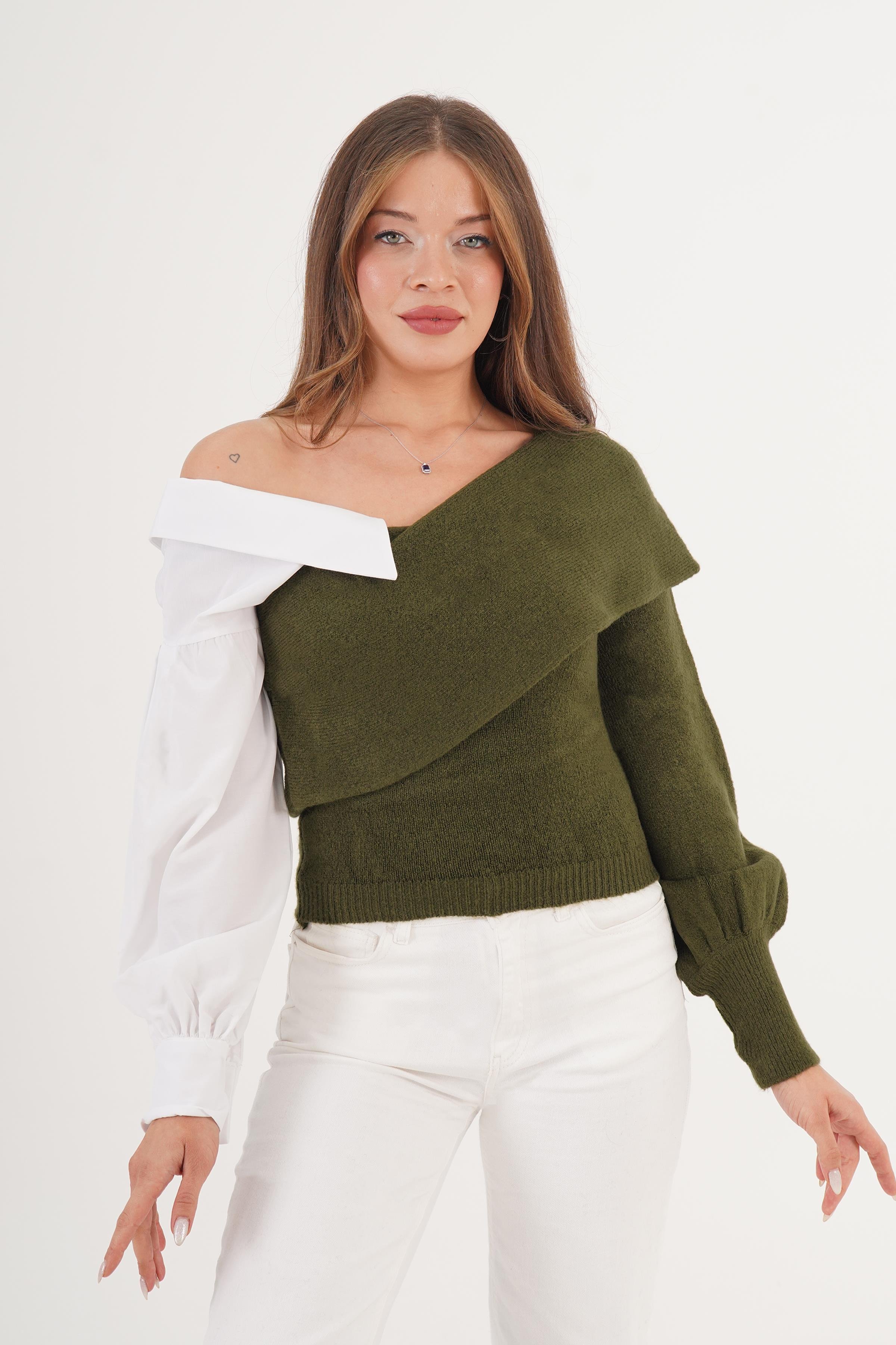 Yarı Gömlek Yarı Triko Toptan Haki Kazak (6651-HAKİ)